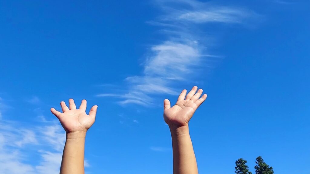 椅子に座ったまま、両腕を上に伸ばして深呼吸。背骨を天井に引っ張られるイメージで伸びる。5秒キープして脱力。