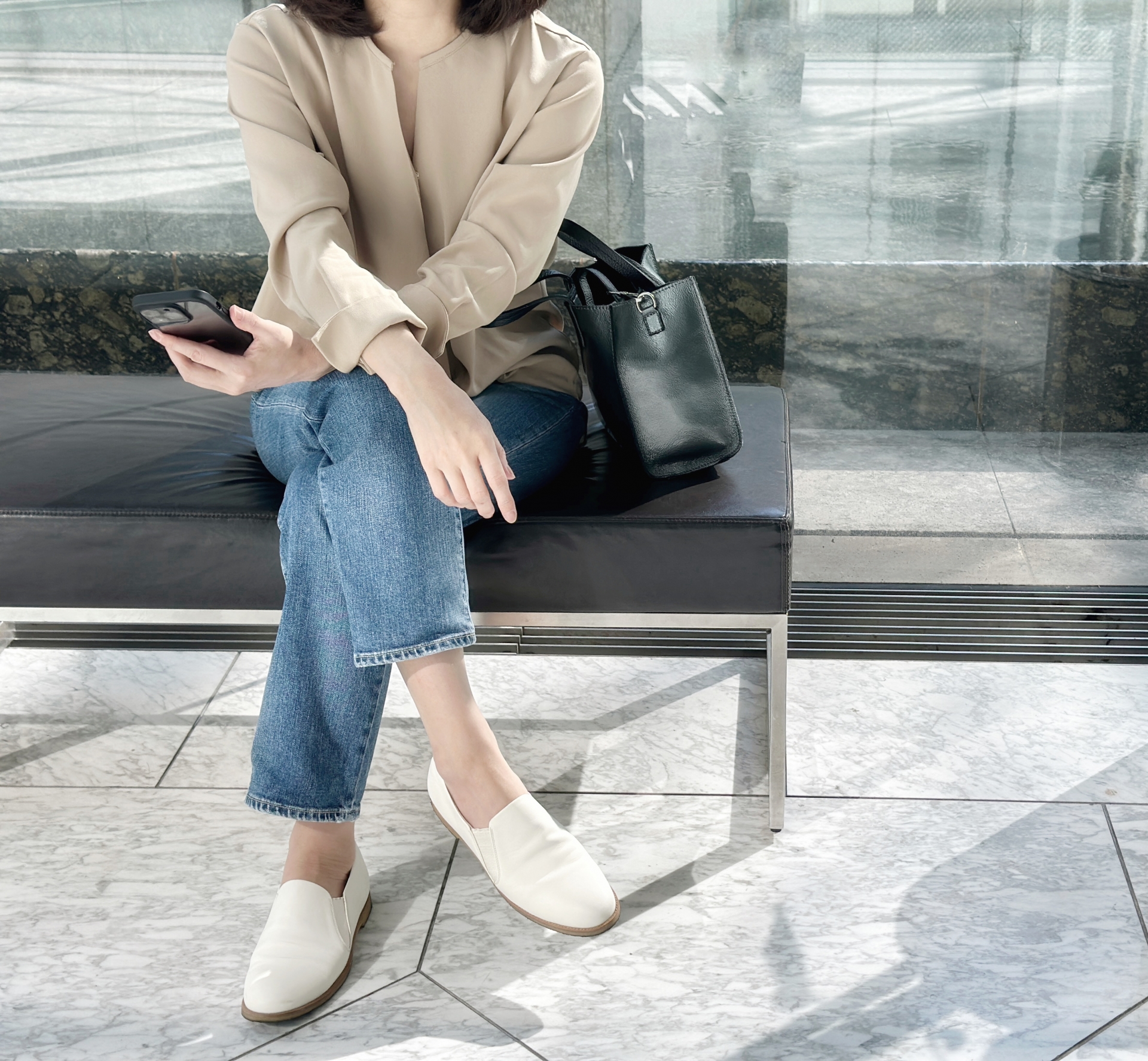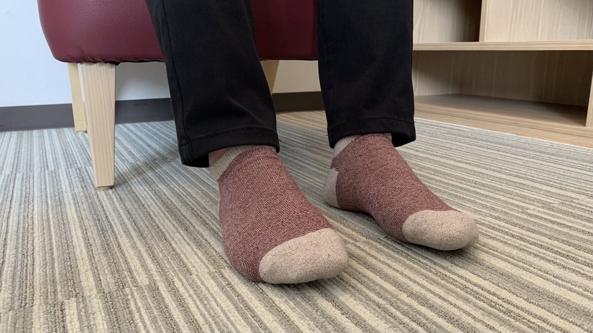 座るときに足裏をしっかり床につけ、足裏全体で床を押すイメージを持つ。かかと・小指球・親指球の3点で均等に体重を支えます。